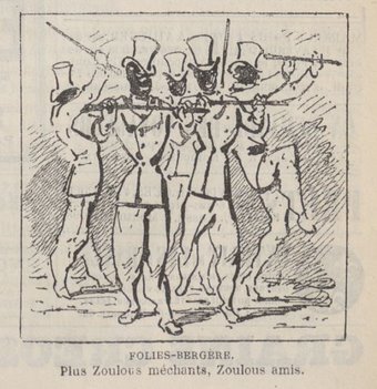In ganz Europa entstand im Zusammenhang mit den kolonialen Bestrebungen der Briten in Südafrika ein überaus großes Interesse an den Zulus. Besonders in Frankreich (natürlich). Der Tod des Prinzen Louis Napoleon, der nach der endgültigen Abschaffung der französischen Monarchie mit seiner Familie im britischen Exil lebte und am 1. Juni als Offizier der britischen Truppen im Zulukrieg, durchbohrt von 18 Speeren (Assegais), gefallen war, verliehen dem öffentlichen Interesse einen weiteren Schub. Es kam in Frankreich zu einer regelrechten Zulumanie.1 Kaum ein Tag, wo man nicht etwas in der Zeitung über die Zulus lesen konnte. Und natürlich bemühten sich auch hier Veranstalter, echte Zulus präsentieren zu können. In Paris erregten die fünf wild aussehenden und nur spärlich bekleideten Zulukrieger, die in den schon damals nicht unbedeutenden Folies- Bergère auftraten, besondere Aufmerksamkeit.