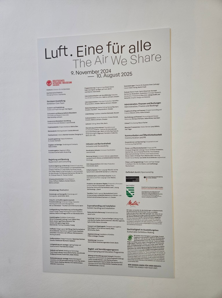 Doch im Falle dieser Ausstellung frage ich mich, für wen diese Ausstellung eigentlich gemacht ist. Obiges Zitat bringt die edukative Zielsetzung dieses Ausstellungsvorhabens deutlich zum Ausdruck. Schaut man sich das Publikum in diesem Haus an, dann kann man sich des Eindrucks nicht erwehren, mal abgesehen von den zwangsvorgeführten Schulklassen, dass wir es hier ganz überwiegend mit Menschen höherer sozialer Schichten mit entsprechenden Bildungsabschlüssen zu tun haben. Menschen, denen klar ist, dass Luft ein höchst schützenswertes Gut ist. Warum also formuliert die Direktorin des Hauses dieses Erziehungsziel? Die, die das noch nicht begriffen haben, kommen freiwillig doch erst gar nicht. Dient es der Selbstvergewisserung und der Bestätigung, dass man selbst auf der richtigen Seite steht? Ich weiß es auch nicht. Ich weiß nur, dass mich diese Ausstellungen, die mir mit erhobenem Zeigefinger sagen, was ich zu denken habe, mehr und mehr nerven. Mir reicht es vollkommen, wenn ich einer Ausstellung die Fakten dargelegt bekomme und selbst entscheiden darf, welche Schlussfolgerungen ich daraus ziehe.